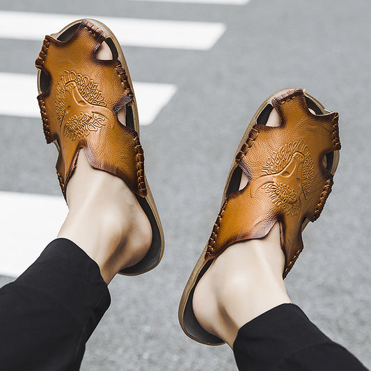 Men's Large Size Breathable Slippers Two-layer Leather Casual Shoes Summer Beach Shoes Men