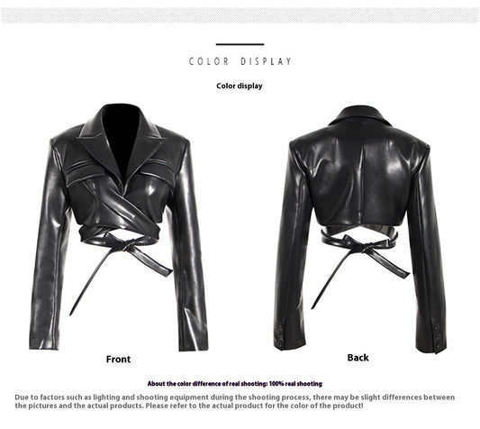 Full Open Cross Lace-up Waist-controlled Chest-flattering Long Sleeve PU Leather Short Coat