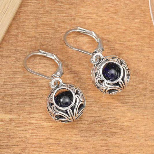 Vintage Engraving Hollow Blue Gemstone Pendant Earrings