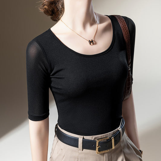 Women's Elegant Scoop Mesh T-shirt Solid Color Waist Stretch Top