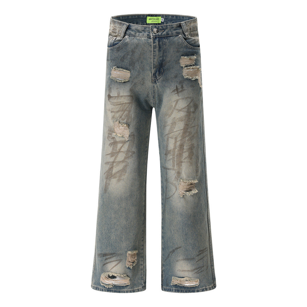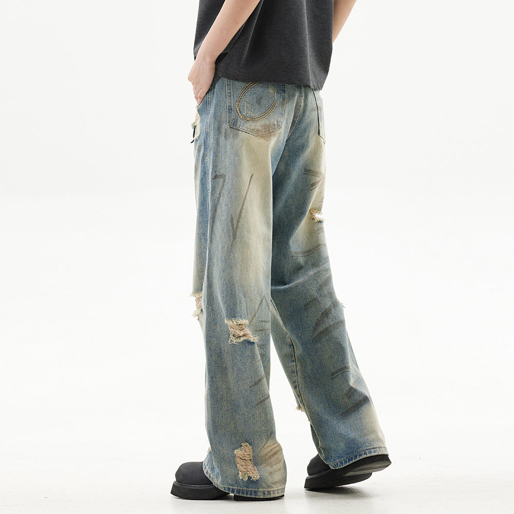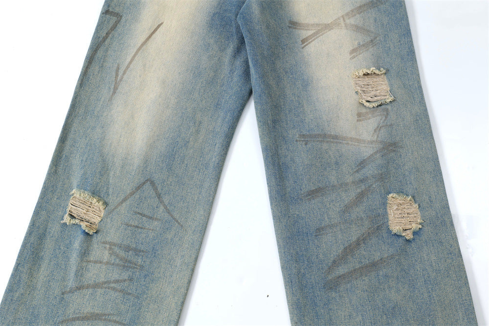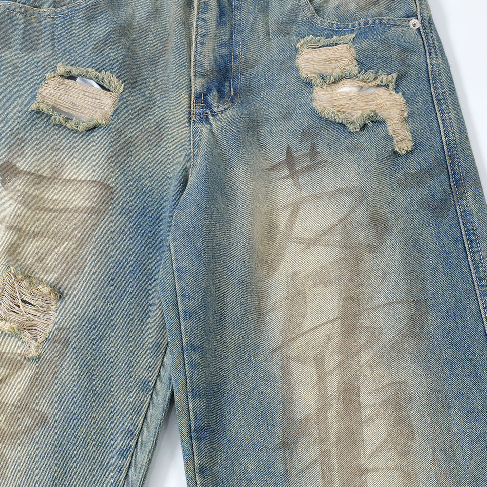 Graffiti Distressed Dirty Ripped Denim Trousers