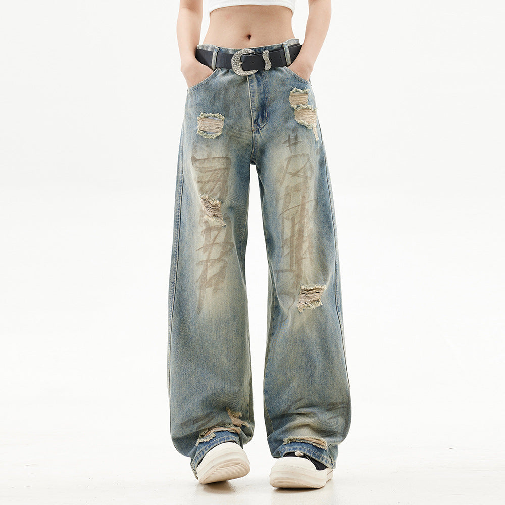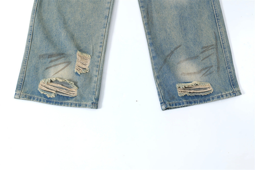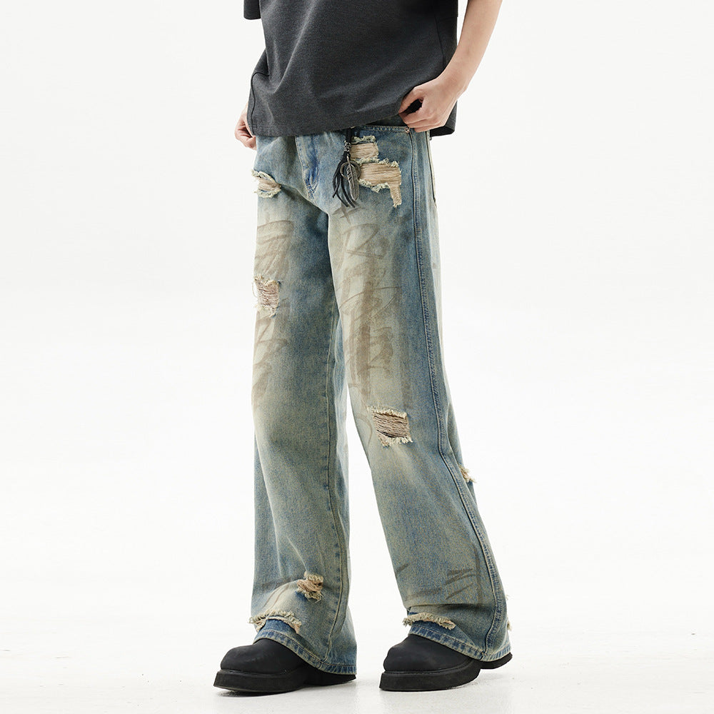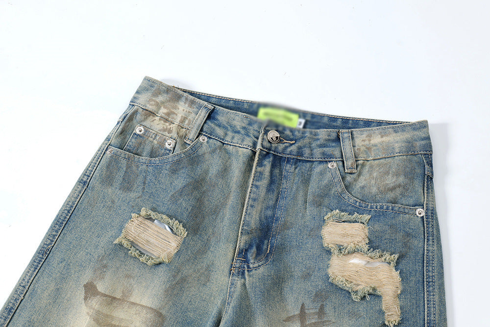 Graffiti Distressed Dirty Ripped Denim Trousers