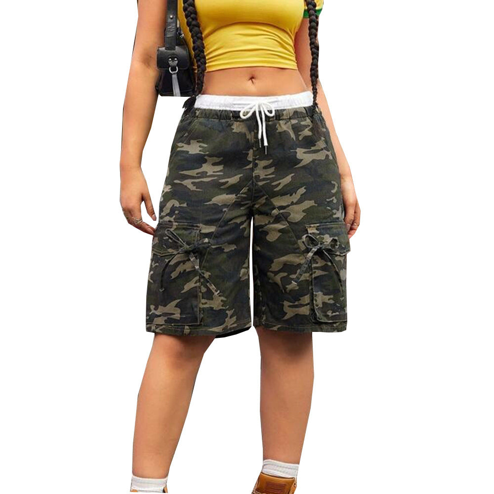 Loose Double Waist Casual Style Camouflage Pocket Drawstring Shorts