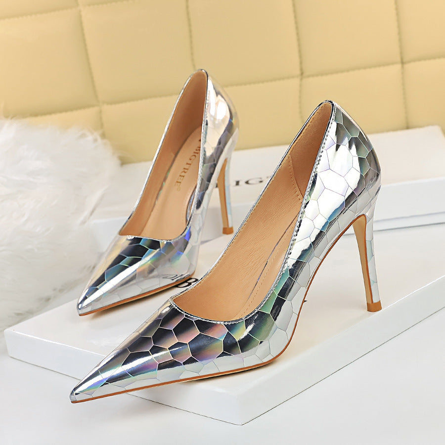 Sexy Stiletto Pumps Pointed Toe Metal Stone Pattern High Heels