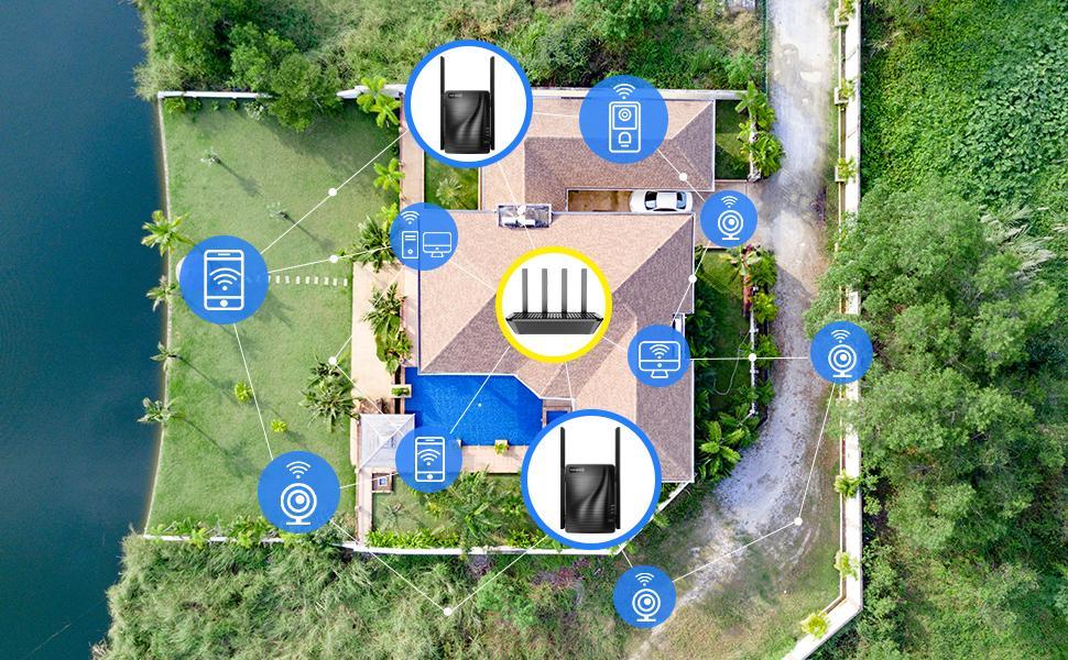 Smart Siganl Switch for Steady Connection. Equipped with high quality PCB dual band antennas and 4T4R MU-MIMO technology, Wifi repeater extends WiFi networks on dual bands.Automatically select high quality channel for stable, reliable and fast Internet.Compared with traditional 2T2R MU-MIMO,AC2100 wifi range extender keeps your devices stay connected even in the move by switching to the network with stronger signals